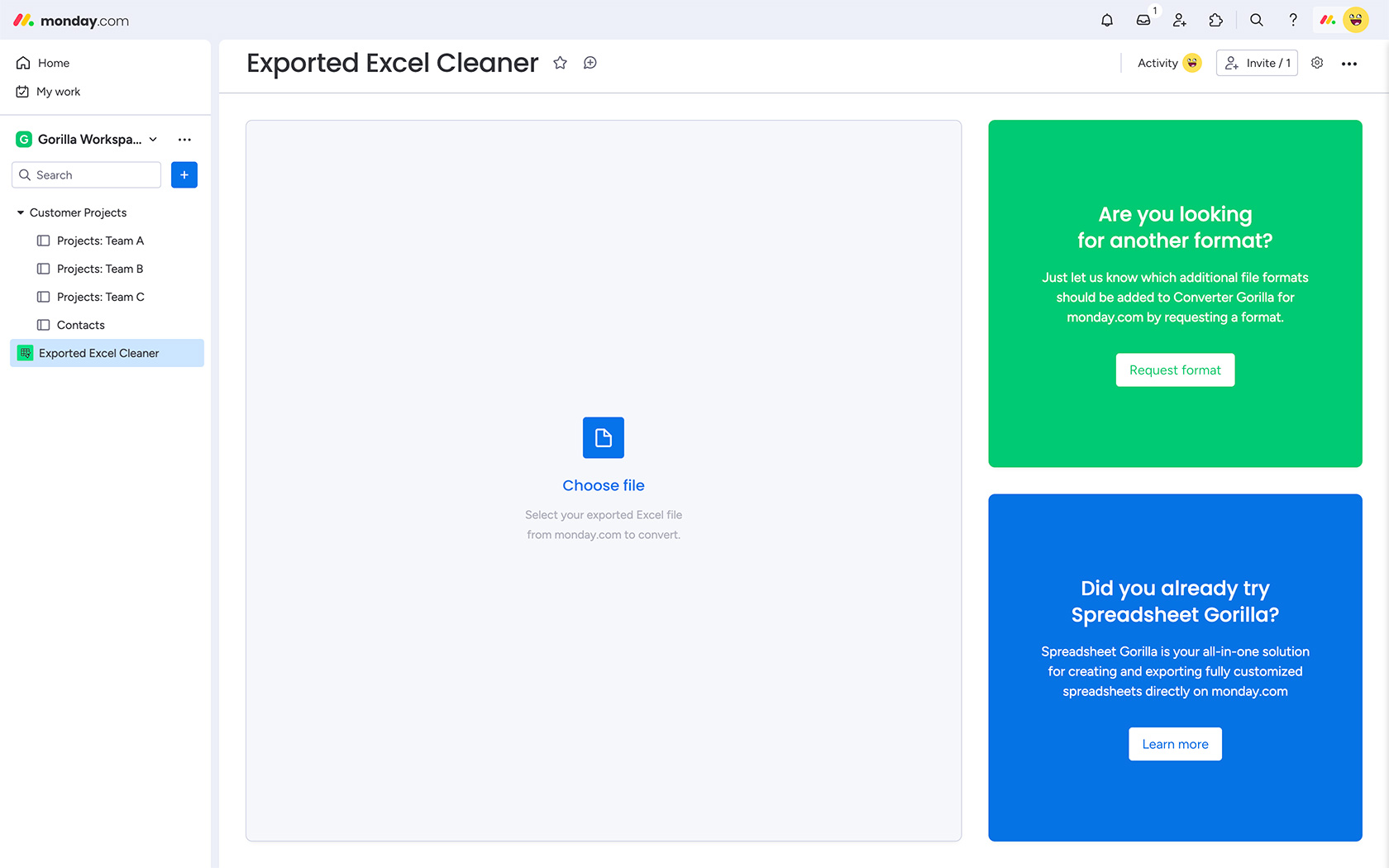 Simply click Choose file in the app, and navigate to the folder where the exported and downloaded Excel file from monday.com is located. You can only choose one file at this point, but repeat this step anytime.