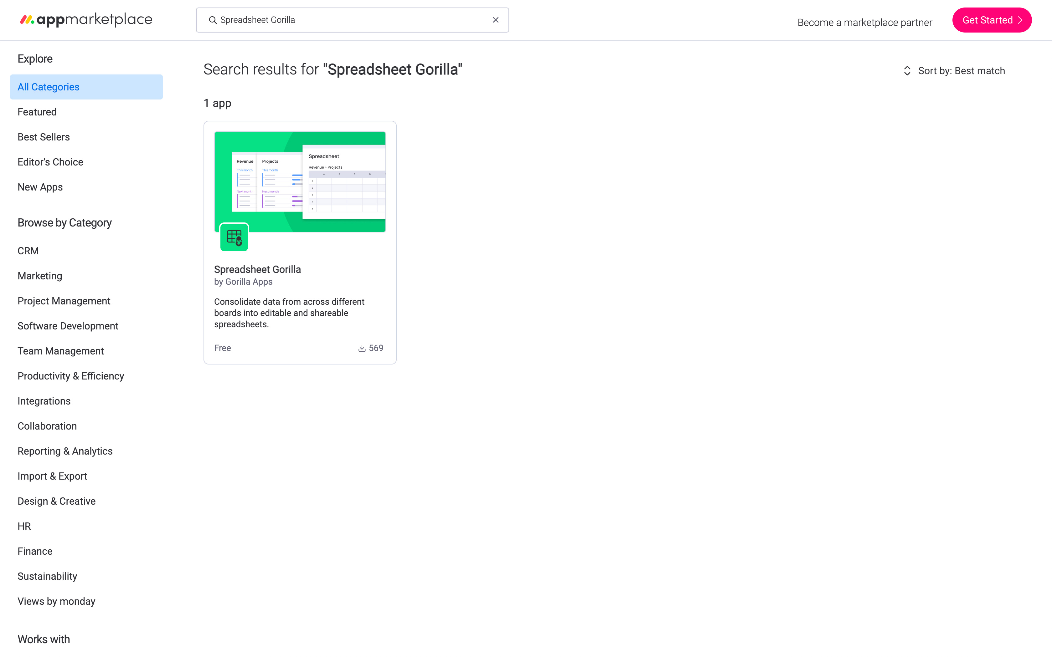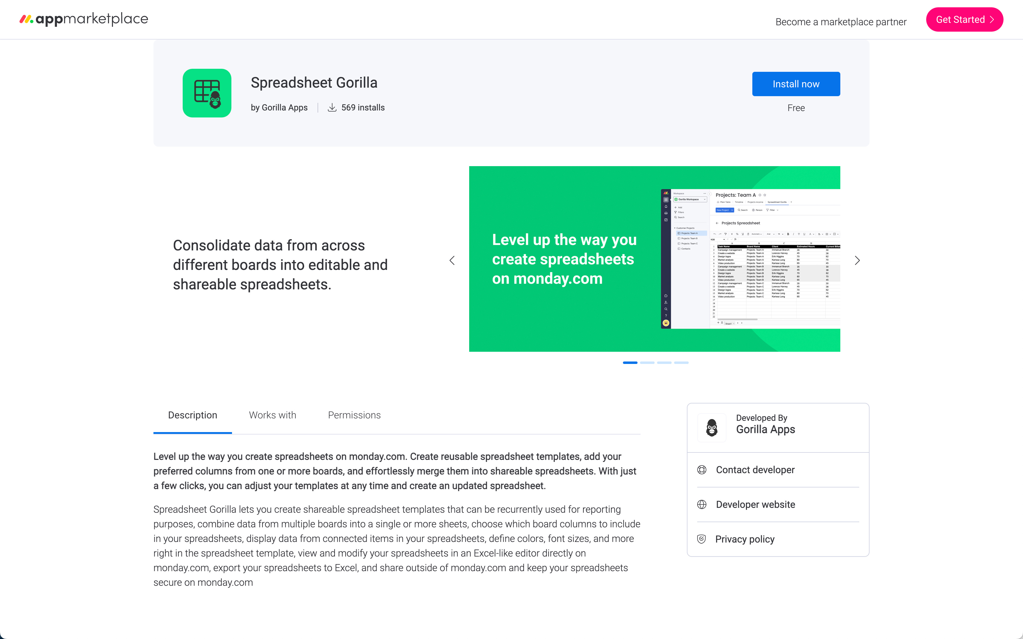 Head over to monday.com's marketplace, either directly or from within monday.com, and search for Spreadsheet Gorilla. Click on the shown app listing to proceed to the apps detail page.