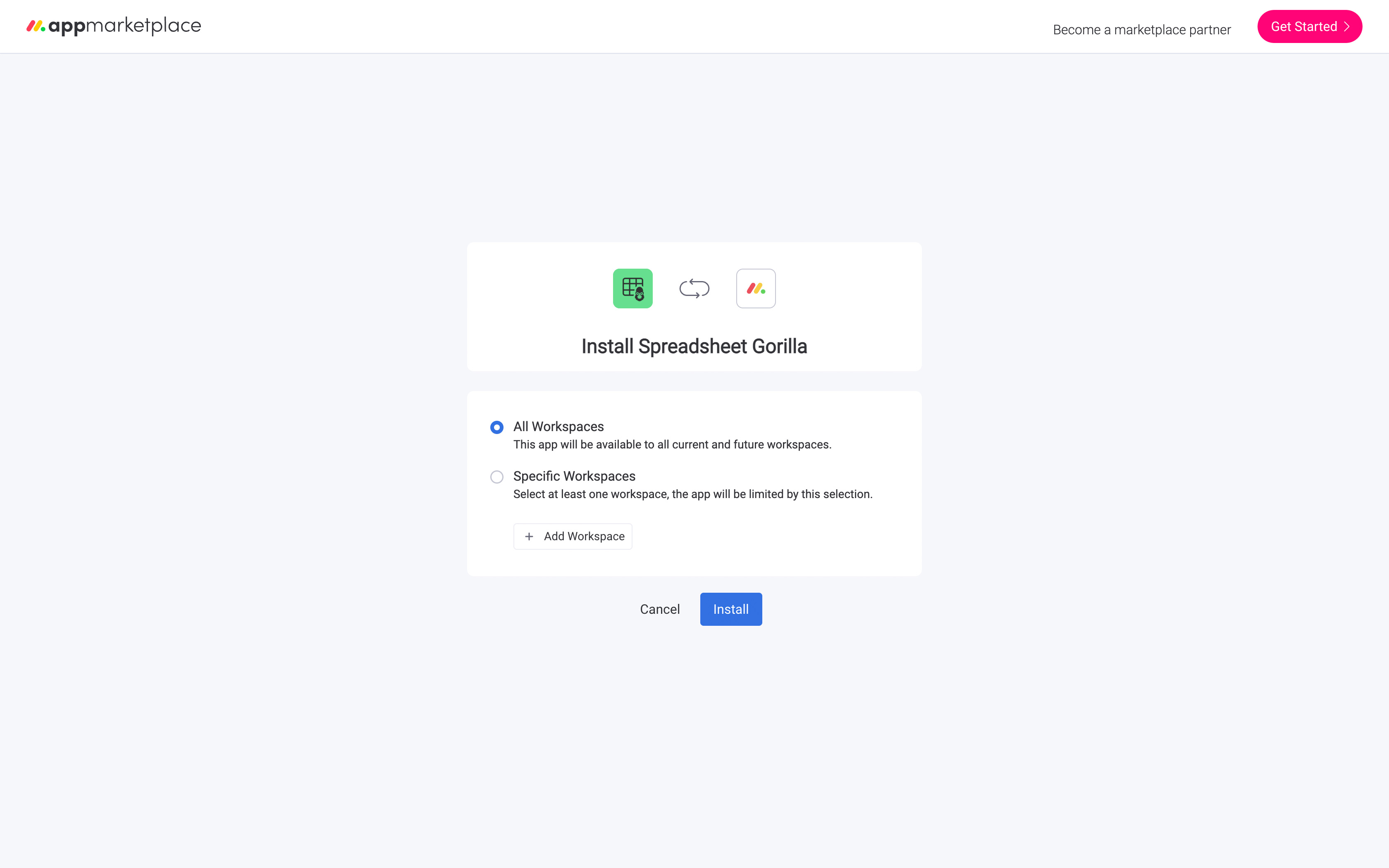 Make sure you have the proper permissions to install the app, if not please contact your monday.com administrator. Click the Install button to add Spreadsheet Gorilla for monday.com to your account.